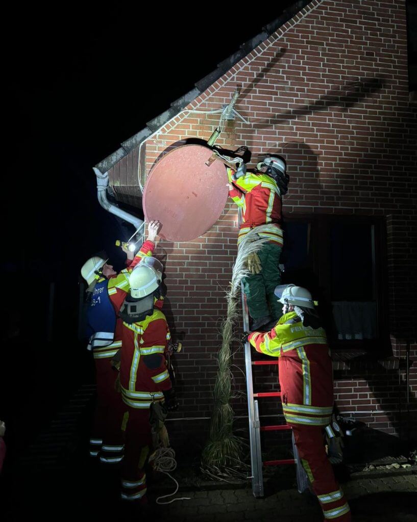 Auch die Freiwillige Feuerwehr Leck wurde in der vergangenen Sturmnacht zu einem Einsatz alarmiert. Gegen 01:30 Uhr alarmierte die Regionalleitstelle Nord mit dem Alarmstichwort TH DRZF – Objekt droht zu fallen – in die Theodor-Storm-Straße. An einem Wohnhaus hatte sich eine Satellitenschüssel gelöst und drohte zu fallen. Das Objekt wurde durch die Feuerwehr gesichert. Weiteres Eingreifen war nicht erforderlich.