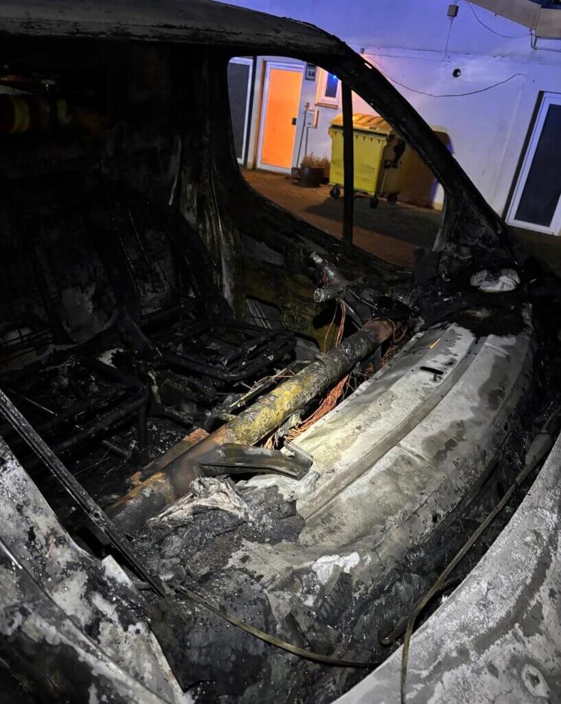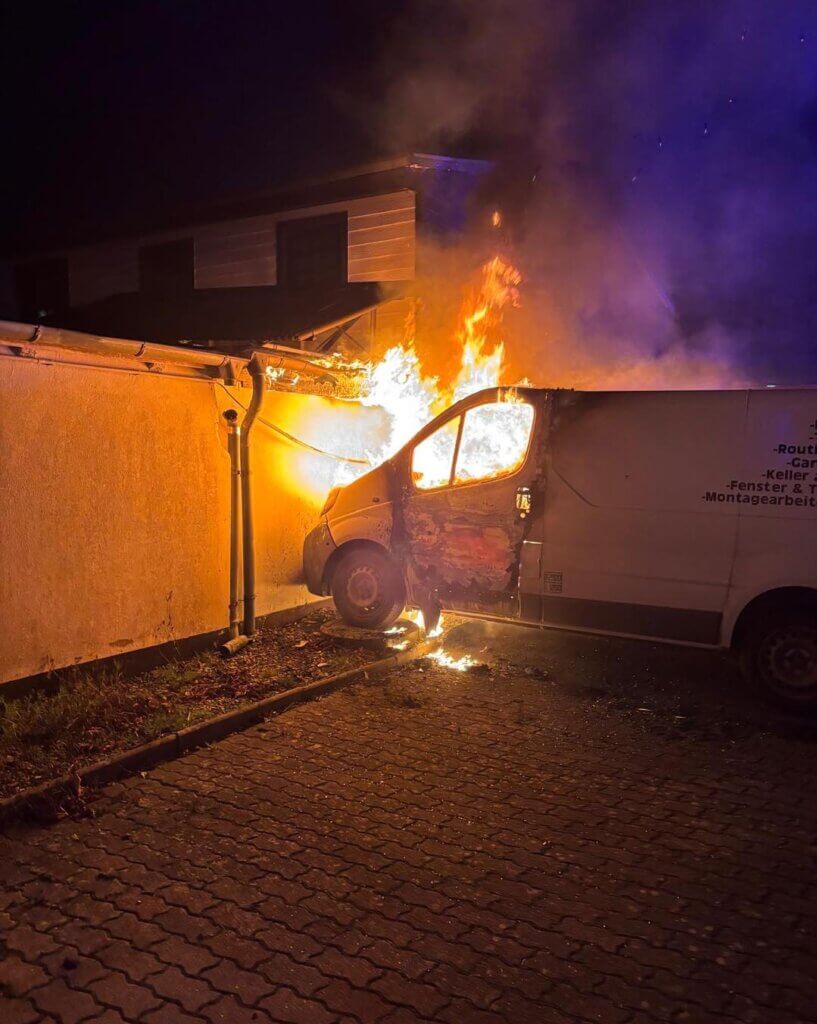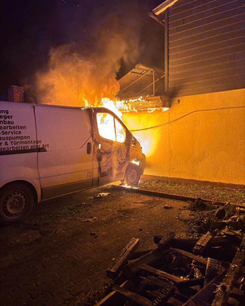 Gegen 1:23 Uhr wurde die FF Leck zu einem Fahrzeugbrand in die Marktstraße alarmiert. Bereits beim Eintreffen bestätigte sich die Lage der Alarmierung. Ein Kleinbus brannte im Motorbereich und die Flammen drohten auf auf ein angrenzendes Gebäude überzugreifen. Das Feuer wurde durch einen Trupp unter Atemschutz zunächst am Gebäude und anschließend am Fahrzeug gelöscht. Ein weiteres Übergreifen des Feuers auf das Gebäude konnte so verhindert werden. Lediglich ein angrenzender Raum wurde leicht verraucht, dieser wurde anschließend belüftet. Zur Sicherheit wurde das abgelöschte Fahrzeug geöffnet und es wurden einige Akkus von Handwerkermaschinen aus dem Gefahrenbereich entfernt und gesichert.