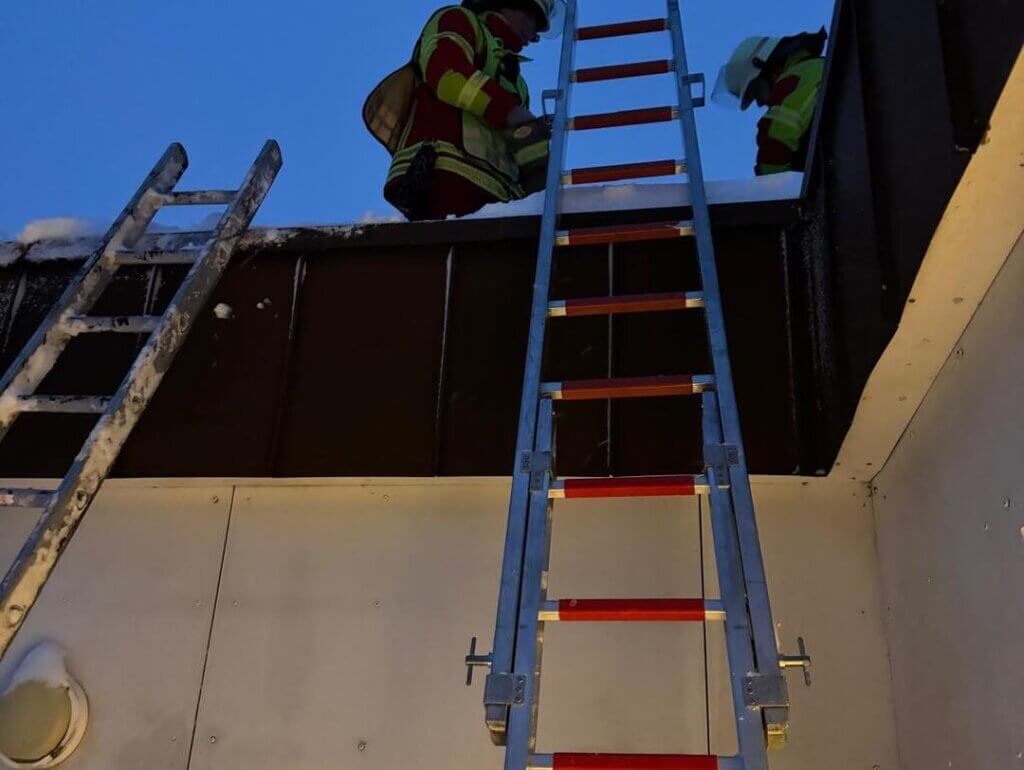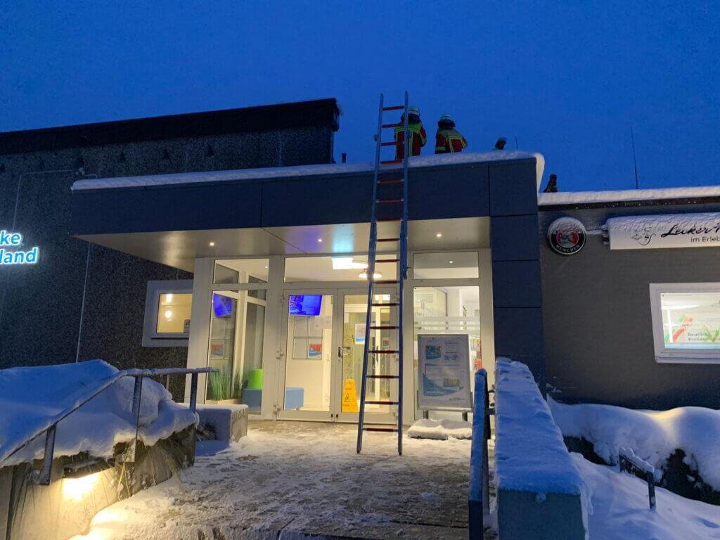Die FF Leck wurde zur Unterstützung der Schneeräumarbeiten auf dem Dach des Erlebnisbades in Leck alarmiert. An einer Schrägung des Daches wurden die Schneemassen vorsorglich vom Dach geräumt.
