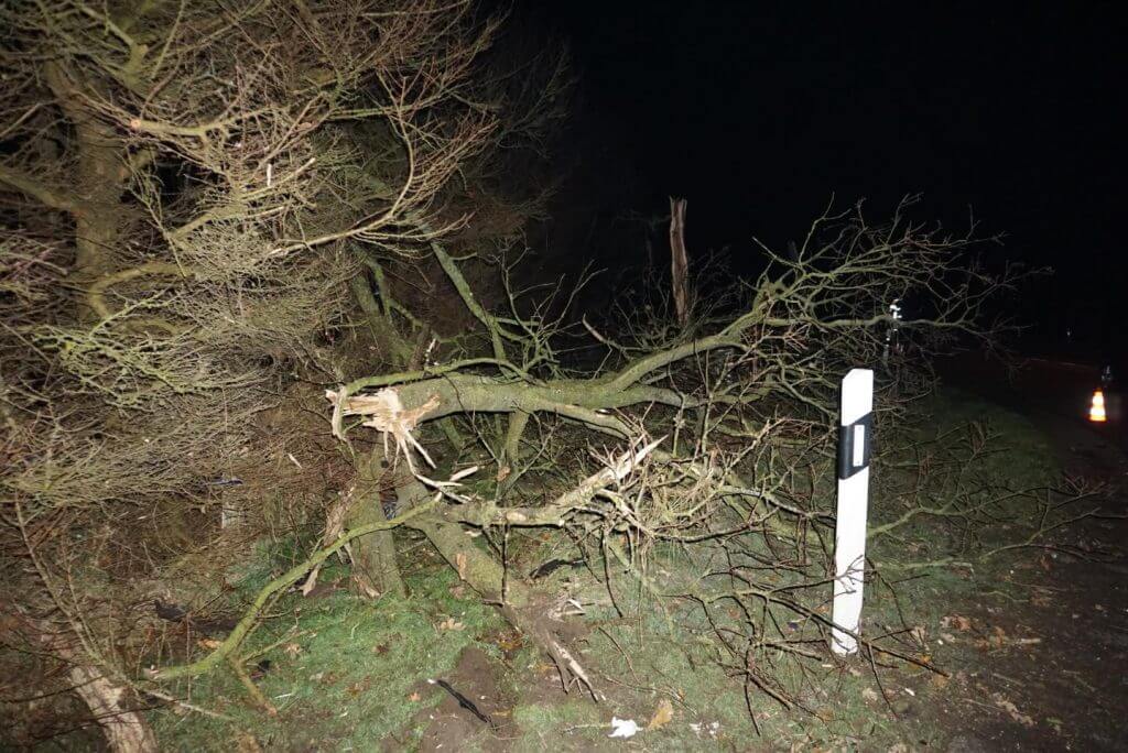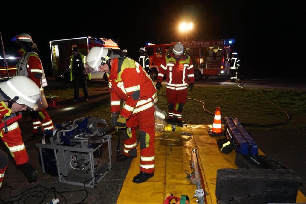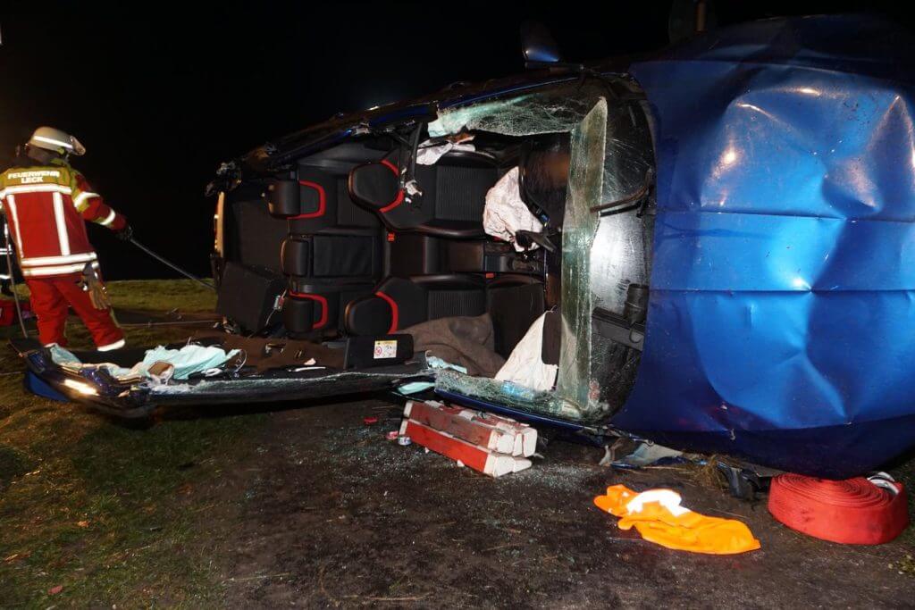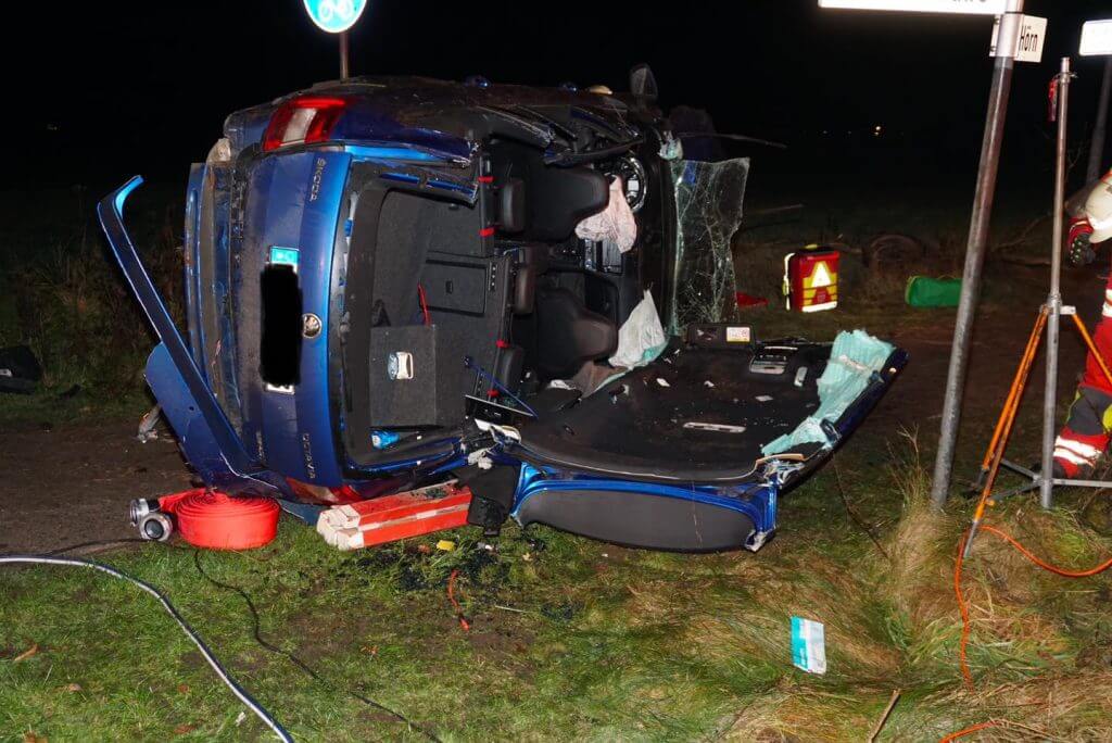 Kurz vor Mitternacht alarmierte die Leitstelle Nord u.a. die FF Leck mit dem Alarmstichwort – TH Y – Technische Hilfeleistung mit Menschenleben in Gefahr – nach Enge-Sande, B5 – Hörn. Ein PKW war aus ungeklärter Ursache von der Fahrbahn abgekommen, gegen einen Baum geprallt und auf der Beifahrerseite liegend zum Stillstand gekommen. Eine Person war im Fahrzeug eingeschlossen und konnte sich nicht aus eigener Kraft aus dem Fahrzeug befreien. Die FF Enge-Sande war als örtliche Feuerwehr zuerst vor Ort und stellte nach der Erkundung der Lage und Kontaktaufnahme mit der eingeschlossenen Person den Brandschutz sicher. Die FF Leck führte in Abstimmung mit dem Rettungsdienst NF ein Dachöffnung an dem verunfallte Fahrzeug durch und verschaffte so dem Rettungsdienstpersonal den Zutritt zu der verunfallten Person, die dann medizinisch versorgt wurde.